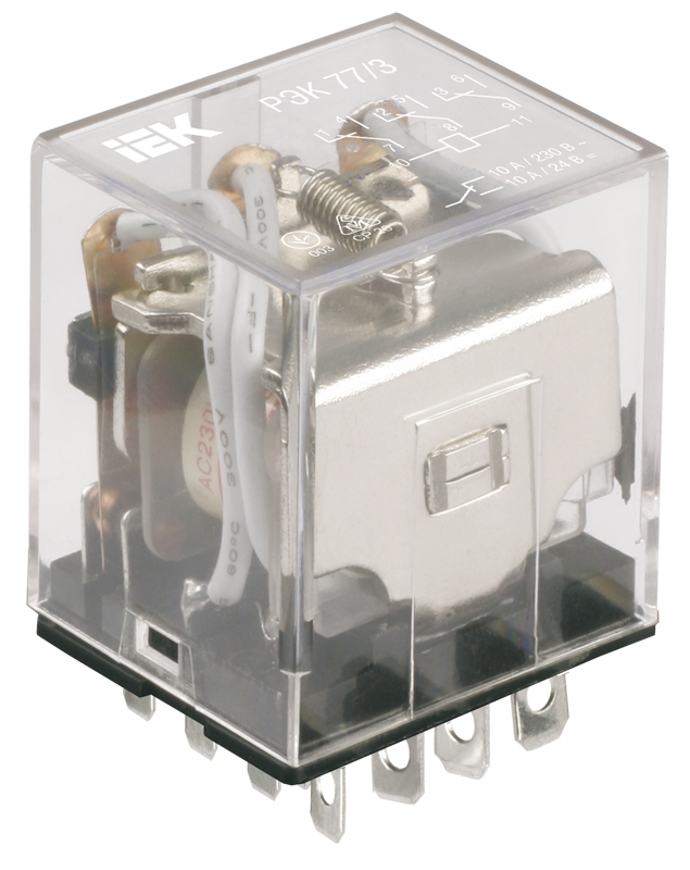 Реле промежуточные модульной серии РЭК77 и РЭК78 предназначены для передачи команд управления исполнительными элементами путем коммутации их электрических цепей своими переключающими контактами. Реле соединяются с розеточными модульными разъемами РРМ77 и РРМ78, устанавливаемыми на 35-мм монтажной DIN-рейке. На разъемах расположены зажимы выводов переключающих контактов и катушки. В реле применяются серебросодержащие контакты. Более высокое значение номинального тока контактов по сравнению с промежуточным реле РП-21 позволяет использовать реле серии РЭК в цепях до 10А. Любое рабочее положение в пространстве. Уменьшенные габариты реле серии РЭК предоставляют возможность более рационального размещения изделий на монтажных плоскостях. Применение серебросодержащих контактов увеличивает их долговечность. Реле может комплектоваться модульными розеточными разъемами для крепления на DIN-рейку и крепления с помощью винтов.- Характеристики
