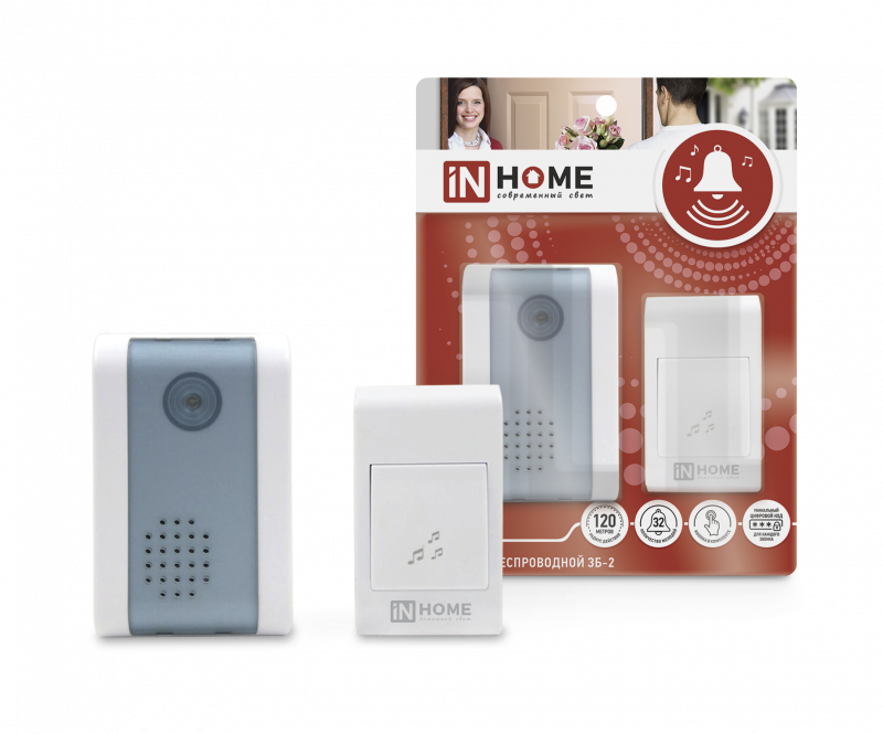 43609 Звонок беспроводной ЗБ-2 32 мелодии 120м с цифровым кодированием с кнопкой БЕЛО-СЕРЫЙ IN HOME