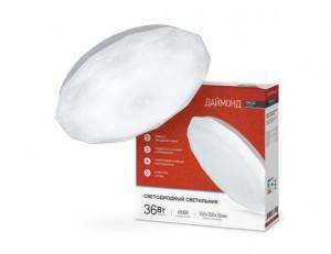 Светодиодный декоративный потолочно-настенный светильник модели «Даймонд» серии «Deco» от компании IN HOME используется для освещения жилых и административных помещений (квартиры, офисы, магазины, гостиницы и т.п.). Рассеиватель из матового прочного пластика имеет форму круглого ограненного камня. Напыление «звездное небо» во включенном режиме добавляет изысканное световое оформление — искристый блеск по поверхности плафона. Качественные светодиоды нового поколения гарантируют немерцающий яркий свет дневного холодного спектра, комфортный для глаз. Мощности 36Вт достаточно для помещений площадью около 15 м2.- Характеристики